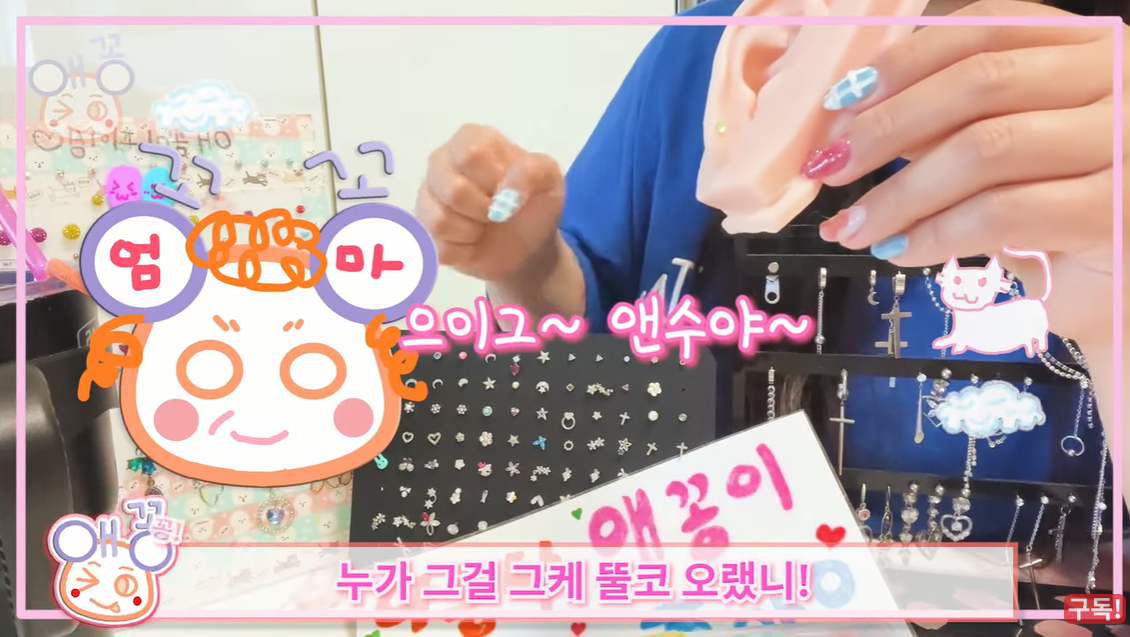 엄마 근데 이뿌지 않아? 뚫으면 안 돼~? 이뿌자나 이거바방~~ 하고 스티커 귀를 보여줘!