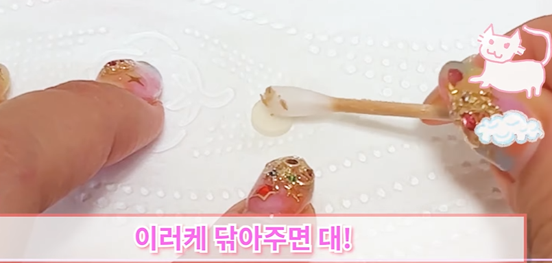 4. 이물질을 다 제거 했다면! 물티슈나 키친타올에 피어싱을 펼쳐서 올려두고, 다시 한번 소독용 에탄올을 골고루 뿌려주고 말려준뒤 다시 끼면 끝!!