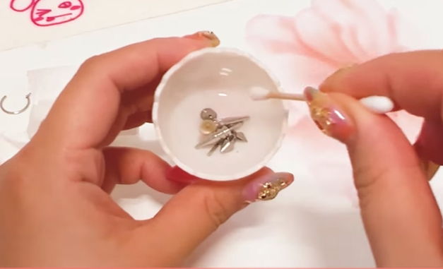 4. 이물질을 다 제거 했다면! 물티슈나 키친타올에 피어싱을 펼쳐서 올려두고, 다시 한번 소독용 에탄올을 골고루 뿌려주고 말려준뒤 다시 끼면 끝!!