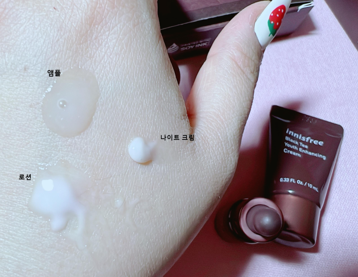 앰플, 로션, 나이트 크림까지 같이 손등에 짜봤당.