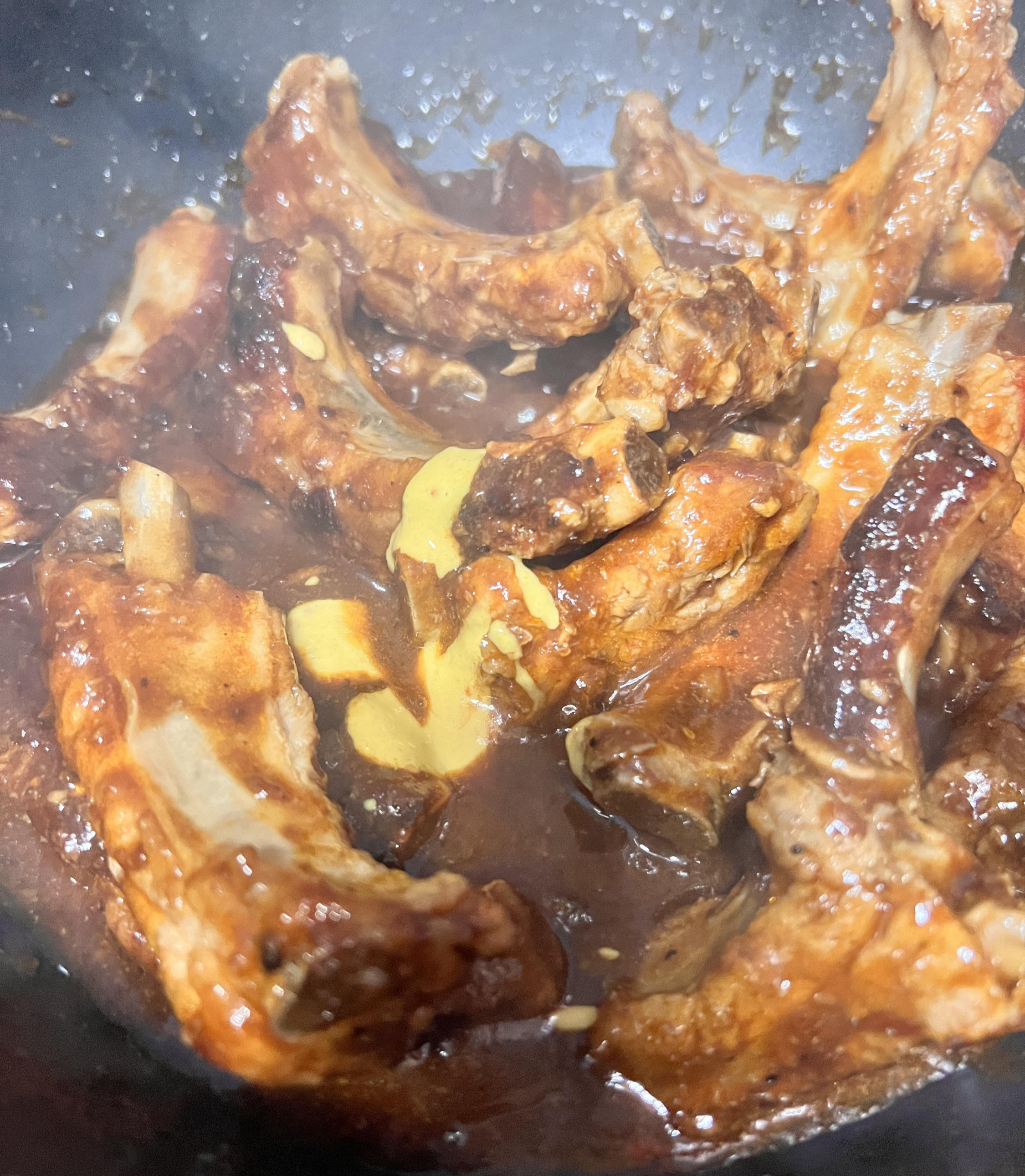 4. 다진 마늘, 다진 양파를 구웠던 립에 넣고 볶아주기—> 바비큐 소스 넣고 쫄이기 (페페론치노, 케이엔페퍼 이때 넣기)